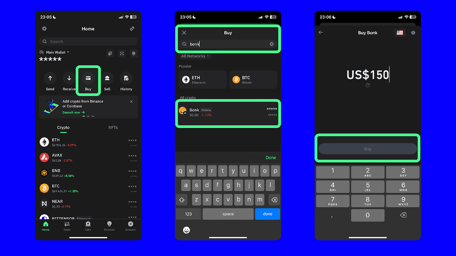 Choose the currency you want to use, then enter the amount of Bonk you want to purchase.